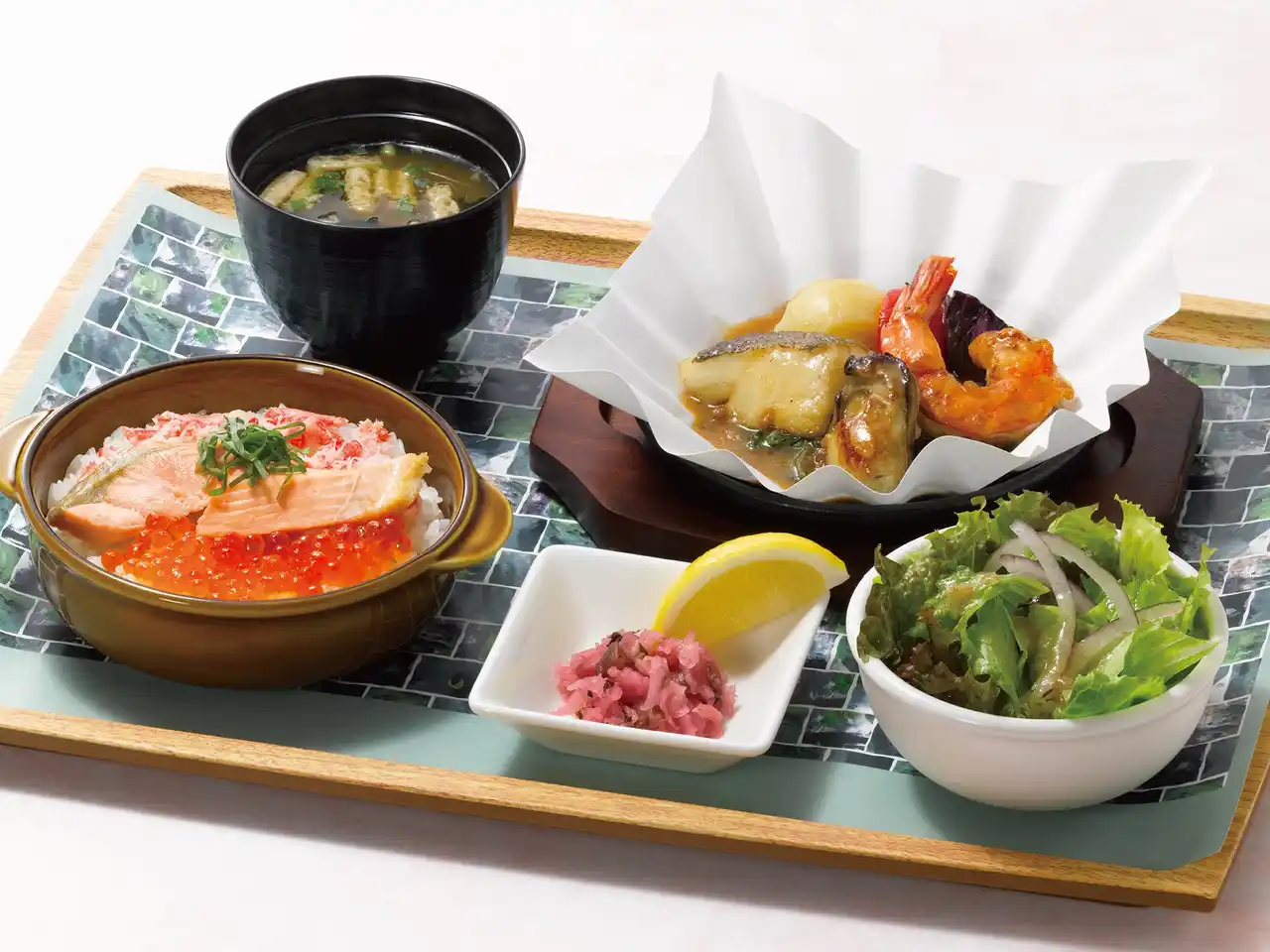 北海道産いくら、適度な脂乗りとやわらかな身質が特徴の時鮭(ときしらず)、国産紅ずわい蟹を盛り合わせたご飯に、北海道産真鱈と北海道産きたあかり、牡蠣(岡山県産)などの旨みをバターのコクと醤油やにんにくの香りが引き立てるあつあつグリルを合わせました。魚介の旨みをお楽しみください。 |