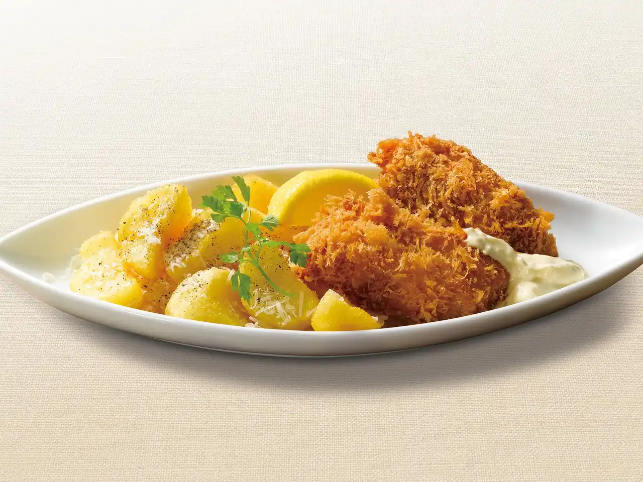 北海道産真鱈のフライは、皮付きの切り身を使用し、白身魚ならではの淡白な美味しさに加え、真鱈本来の味わいを存分に引き出しました。店舗で一枚ずつ丁寧に生パン粉を付けて揚げることで、衣はサクッと、身はふっくらと柔らかな食感に仕上げています。お好みでタルタルソースやレモンをつけてお召し上がりください。ほくほくとした食感と自然な甘みが特徴の北海道産きたあかりのフライドポテトは、ブラックペッパーとパルミジャーノ・レッジャーノがアクセントです。 |