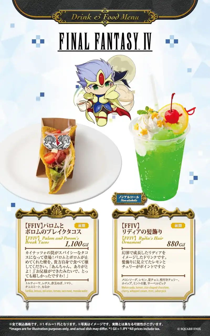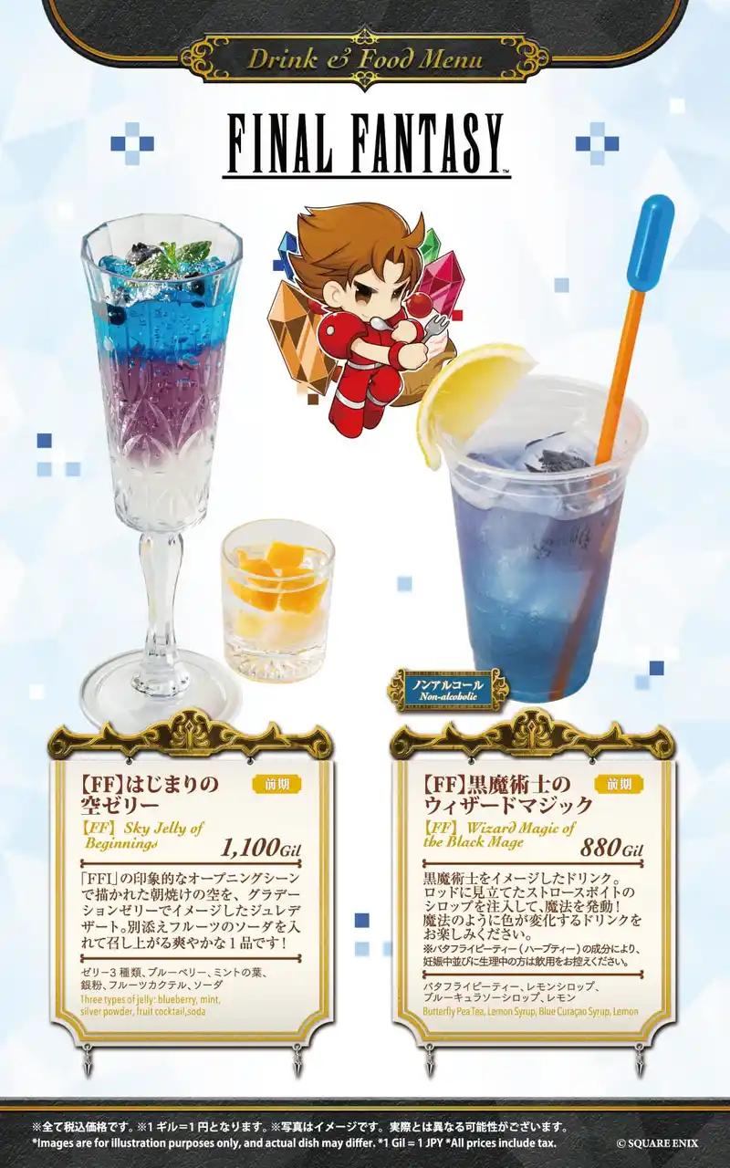 大阪は2月13日(金)~3月2日(月)を前期、3月3日(火)~3月18日(水)を後期として、そして名古屋は『ファイナルファンタジーIX』コラボ終了後の4月10日(金)~4月27日(月)を前期、4月28日(火)~5月18日(月)を後期として、それぞれフード6品、ドリンク6品を展開いたします。 |