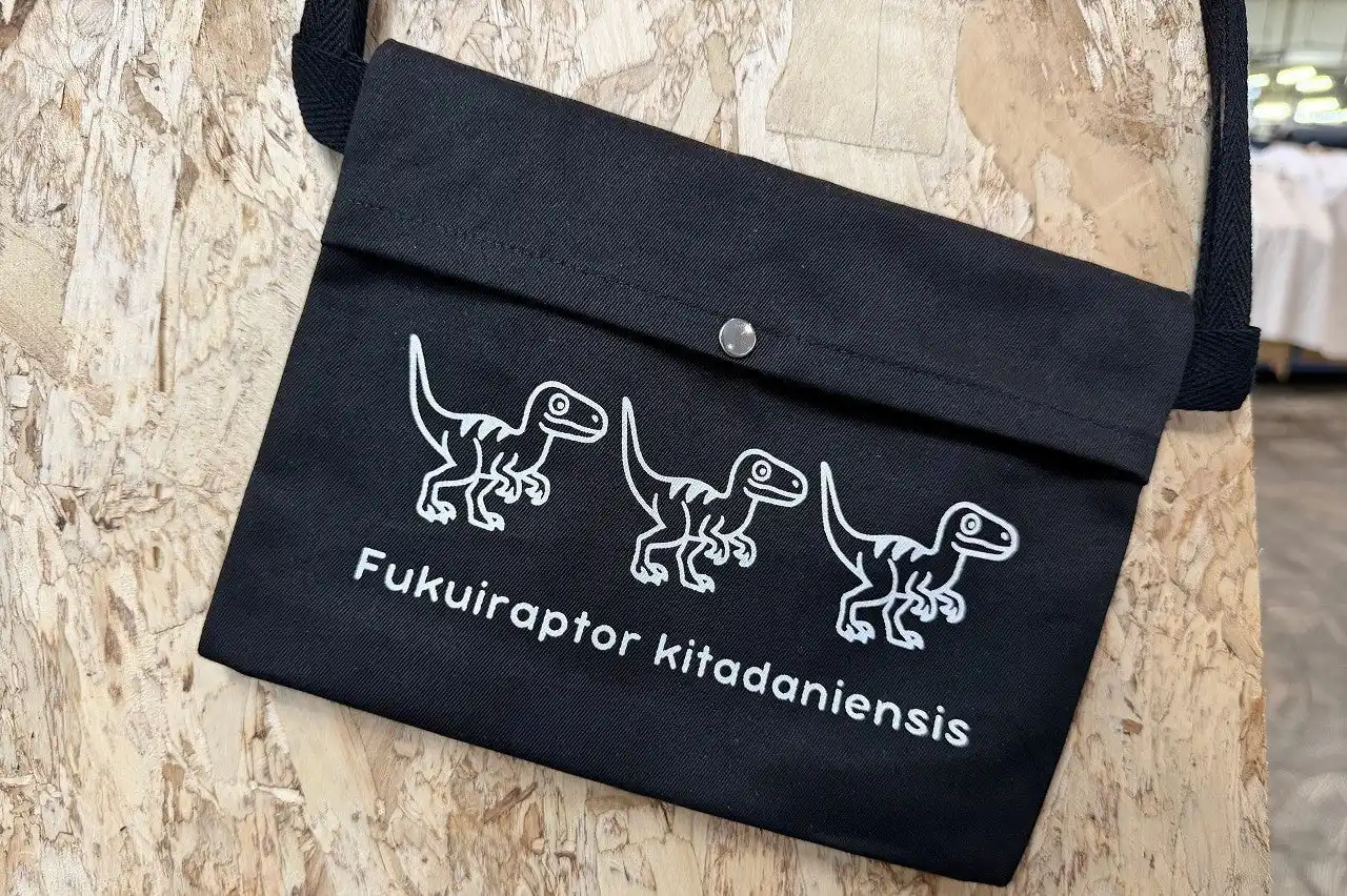 「繊維のまち勝山」の産地に残った材料(=残反[ざんたん])を利活用し、参加者ご自身でオリジナルサコッシュを製作いただきます。デザインは、勝山市で発掘された肉食恐竜「フクイラプトル」などをモチーフとしており、好きな色を選んでシルクスクリーンで生地に印刷します。ミシン操作がありますが、工場スタッフによる丁寧な解説・サポートのもとで、縫製経験が無い方でも安心して本格的なものづくりを体験いただけます。 |