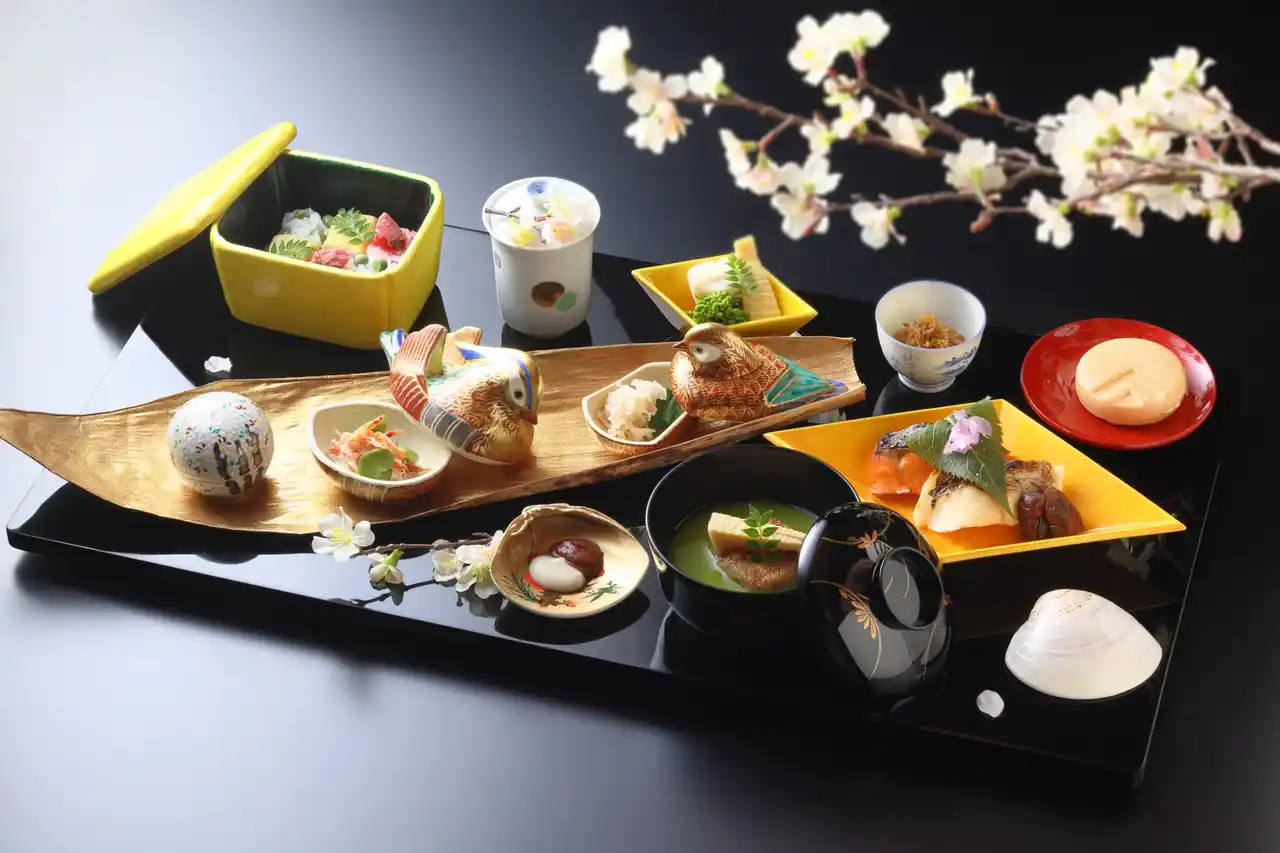 | 朝食は、星のや京都専用の屋形舟「翡翠」を貸し切り、嵐峡の桜を眺めながら味わいます。桜鯛酒焼や桜鱒葡萄酒焼、丹波ワインと白酒の味噌を添えた蛤の香合などを用意します。かつて平安貴族が自然を愛で舟遊びをしたように、川面からの花見を楽しみながら、華やかな特別朝食を味わう贅沢なひとときです。 | |||||||||