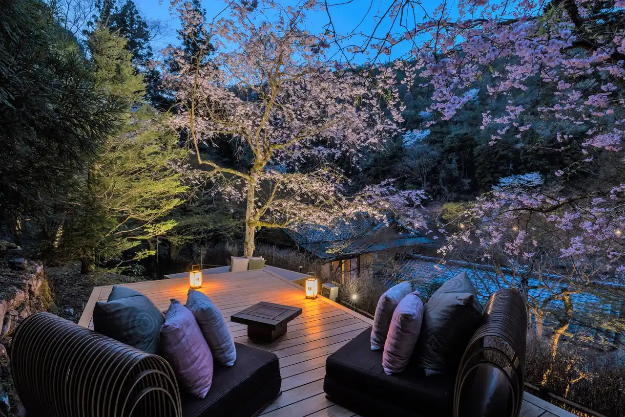 各施設が独創的なテーマで、圧倒的非日常を提供する「星のや」。京都府・嵐山にある全室リバービューの旅館「星のや京都」は、2026年3月25日から4月9日の期間、三つの桜の「特等席」を独り占めする、一日一組限定の滞在プログラム「奥嵐山の花見滞在」提供開始します。夜はライトアップされたしだれ桜が覆う花桜テラスでの特別夕食、朝は川にせり出した空中茶室で山桜を眺めながらの桜茶、その後は、貸し切りの屋形舟で嵐峡の桜を眺めながら朝食を味わいます。三つの桜の特等席を独占し、奥嵐山の静かな環境でプライベートな花見を堪能できる滞在です。