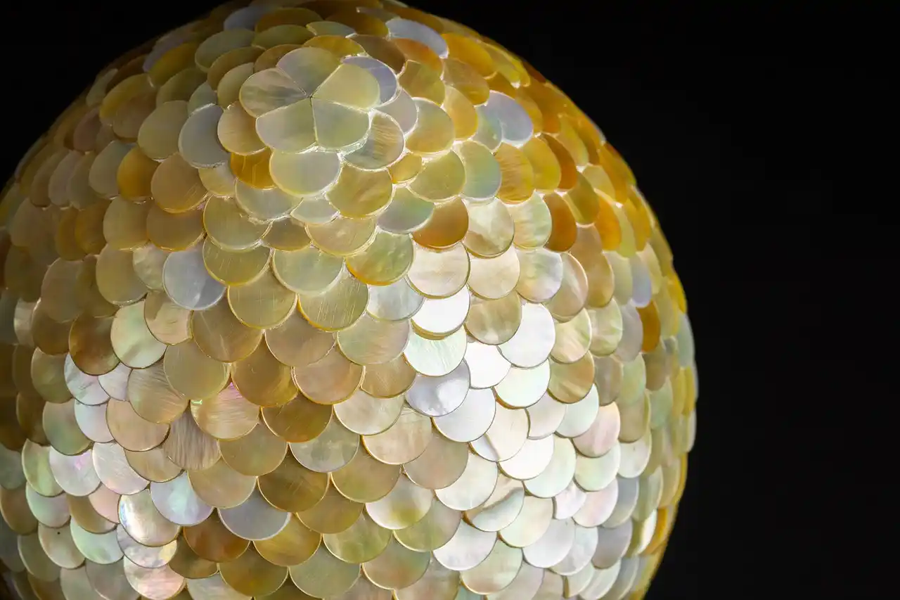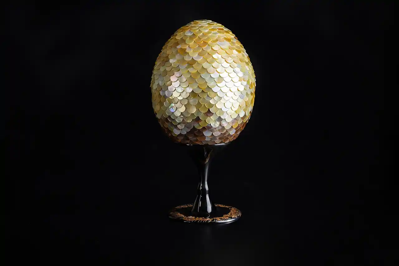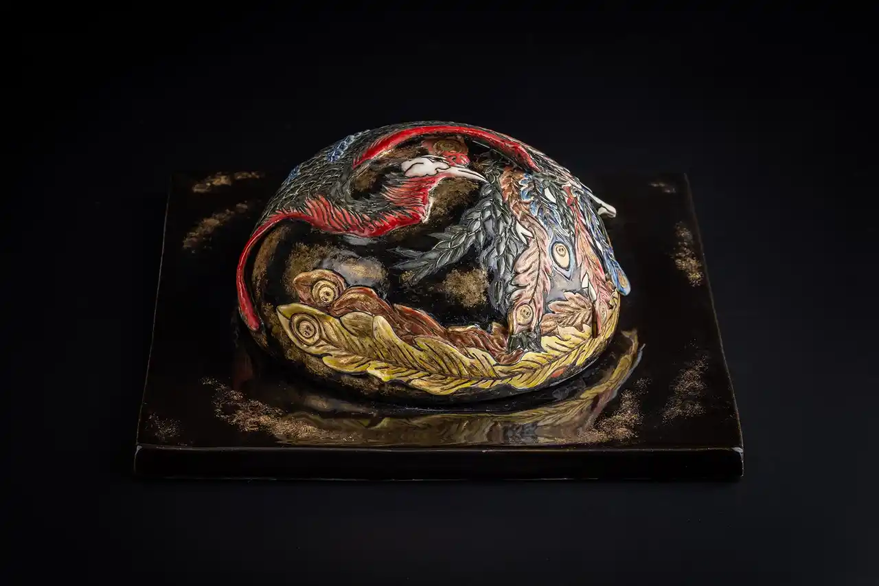 漆芸作家の島本恵未は、「龍」からインスピレーションを受け、独自のアイディアと繊細な技法によって、龍の卵をイメージした螺鈿作品を仕上げました。 |