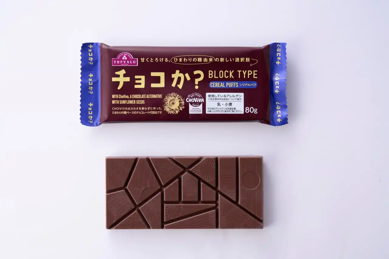 イオンは2025年6月※2より、カカオを使わずに作ったひまわりの種由来のチョコレート代替品“ChoViva”(チョビバ)を使用した菓子「チョコか?」を販売しています。発売以来、新しいおいしさを試したい方やカカオに頼らずチョコレートの風味を楽しみたい方、やさしい甘さで気持ちにリラックス感を得たい方などにご支持をいただき、「カカオ豆が使われていないのにまるでチョコレートのような味わい」「甘さとなめらかさを感じる」「リピートしたい」といったご好評の声が寄せられています。おかげさまで発売から約8カ月となる現在までに、シリーズ販売100万個を突破しました※1。 |