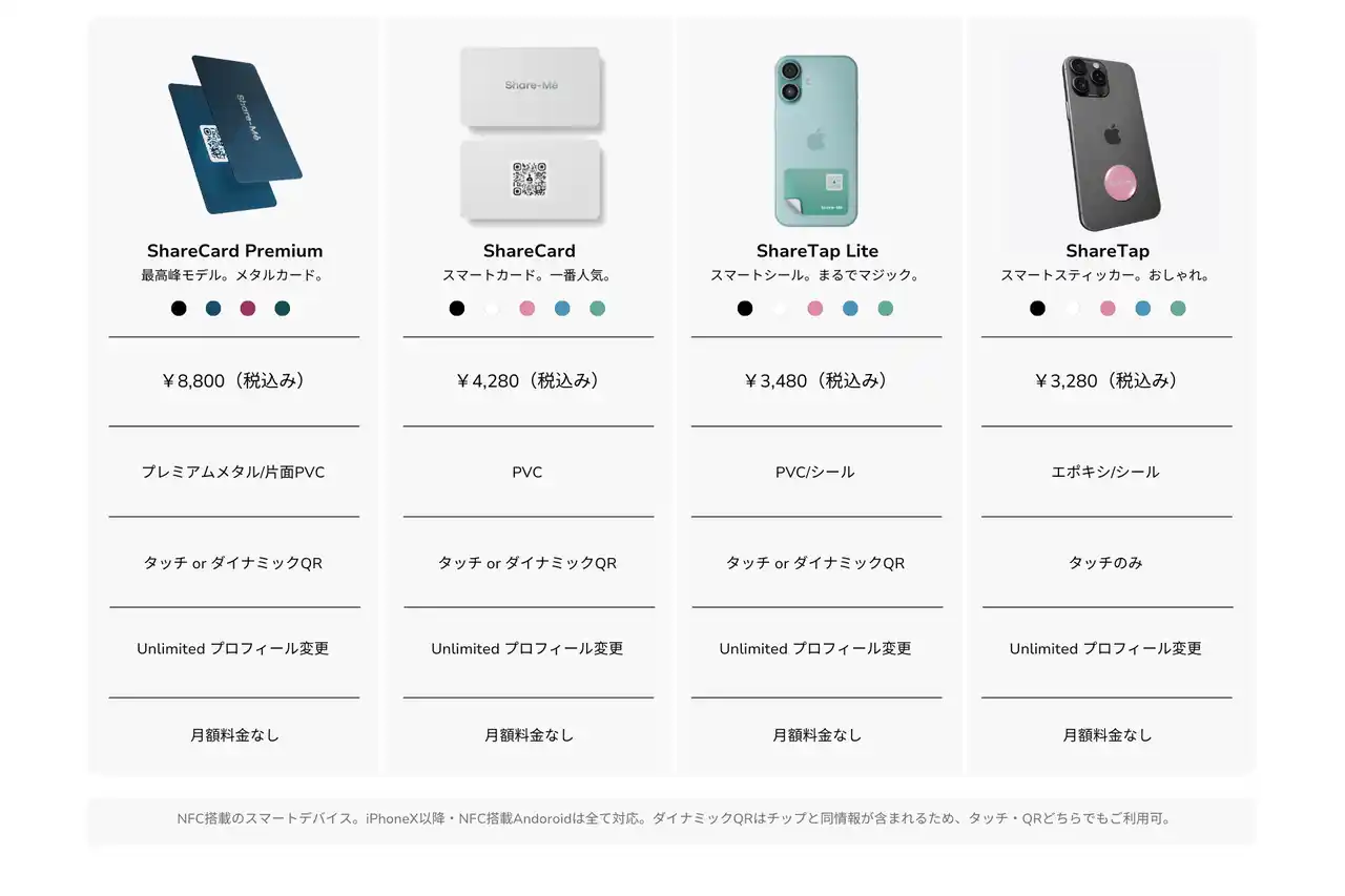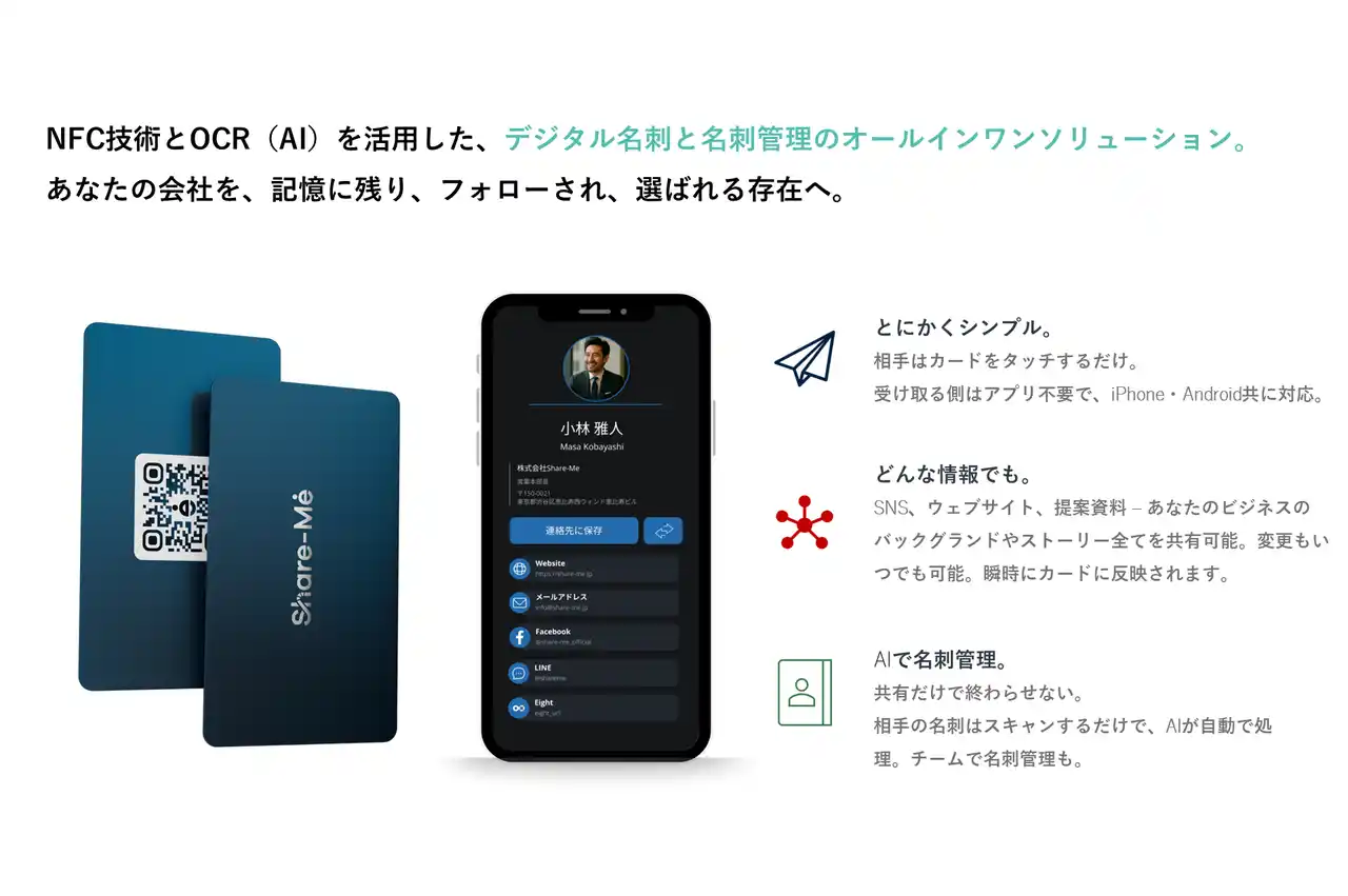 Share-Meは、NFCを搭載したスマート名刺やQRを起点に、「名刺交換」という日常的な行為を、よりスマートで「価値ある体験」へと進化させるサービス。 スマートフォンをかざすだけで、連絡先やSNS、資料などを含むデジタルプロフィールを瞬時に共有でき、その後の関係構築までを一貫してサポート。 |
