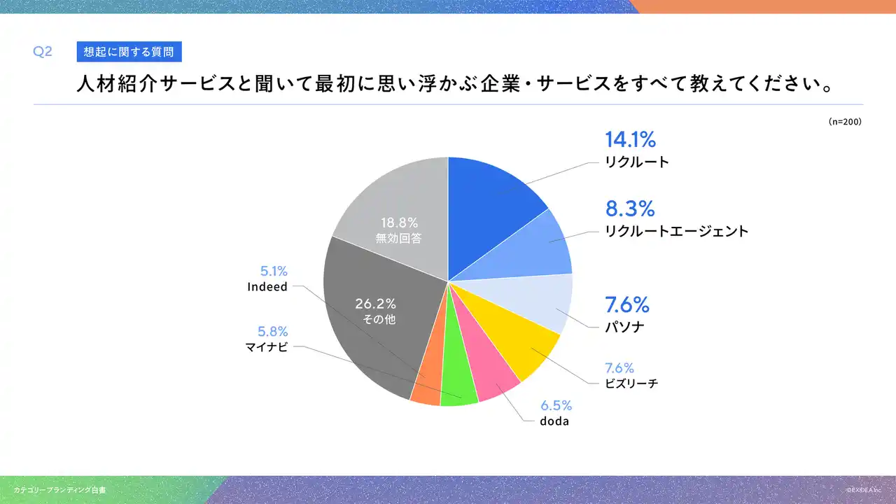 「Q2. 人材紹介サービスと聞いて最初に思い浮かぶ企業・サービスをすべて教えてください。(自由回答)」(n=200)と質問したところ、リクルートが14.1%、リクルートエージェントが8.3%、パソナが7.6%という回答となりました。 |