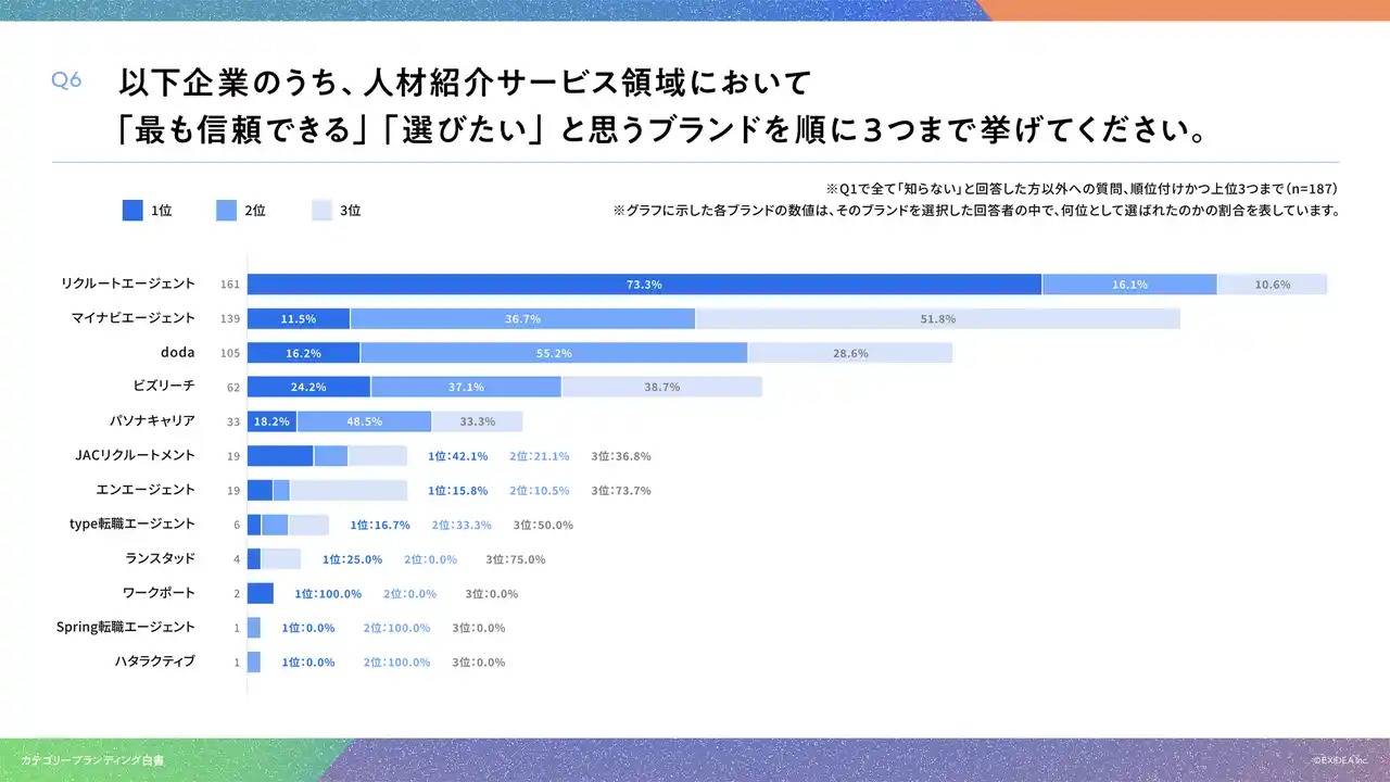 」という結果は、リクルートエージェントを選んだ回答者のうち73.3%が同ブランドを1位として挙げたことを意味します。 |