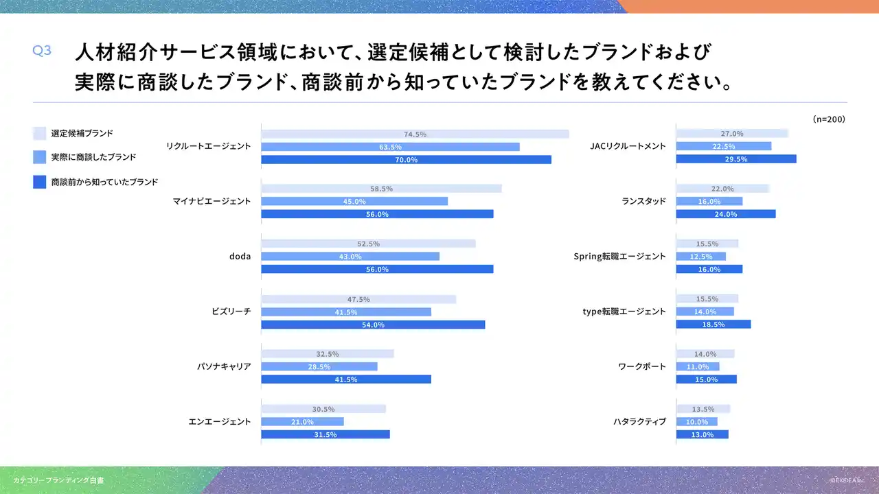 「Q3. 人材紹介サービス領域において、選定候補として検討したブランドおよび実際に商談したブランド、商談前から知っていたブランドを教えてください。」(n=200)と質問したところ、それぞれ選定候補ブランドは「リクルートエージェント」が74.5%、実際に商談したブランドは「リクルートエージェント」が63.5%、商談前から知っていたブランドは「リクルートエージェント」が70.0%という回答となりました。 |