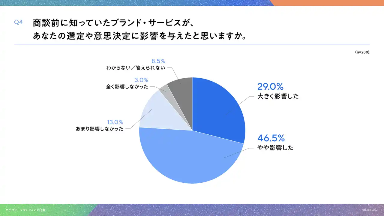 「Q4. 商談前に知っていたブランド・サービスが、あなたの選定や意思決定に影響を与えたと思いますか。」(n=200)と質問したところ、「大きく影響した」が29.0%、「やや影響した」が46.5%という回答となりました。 |