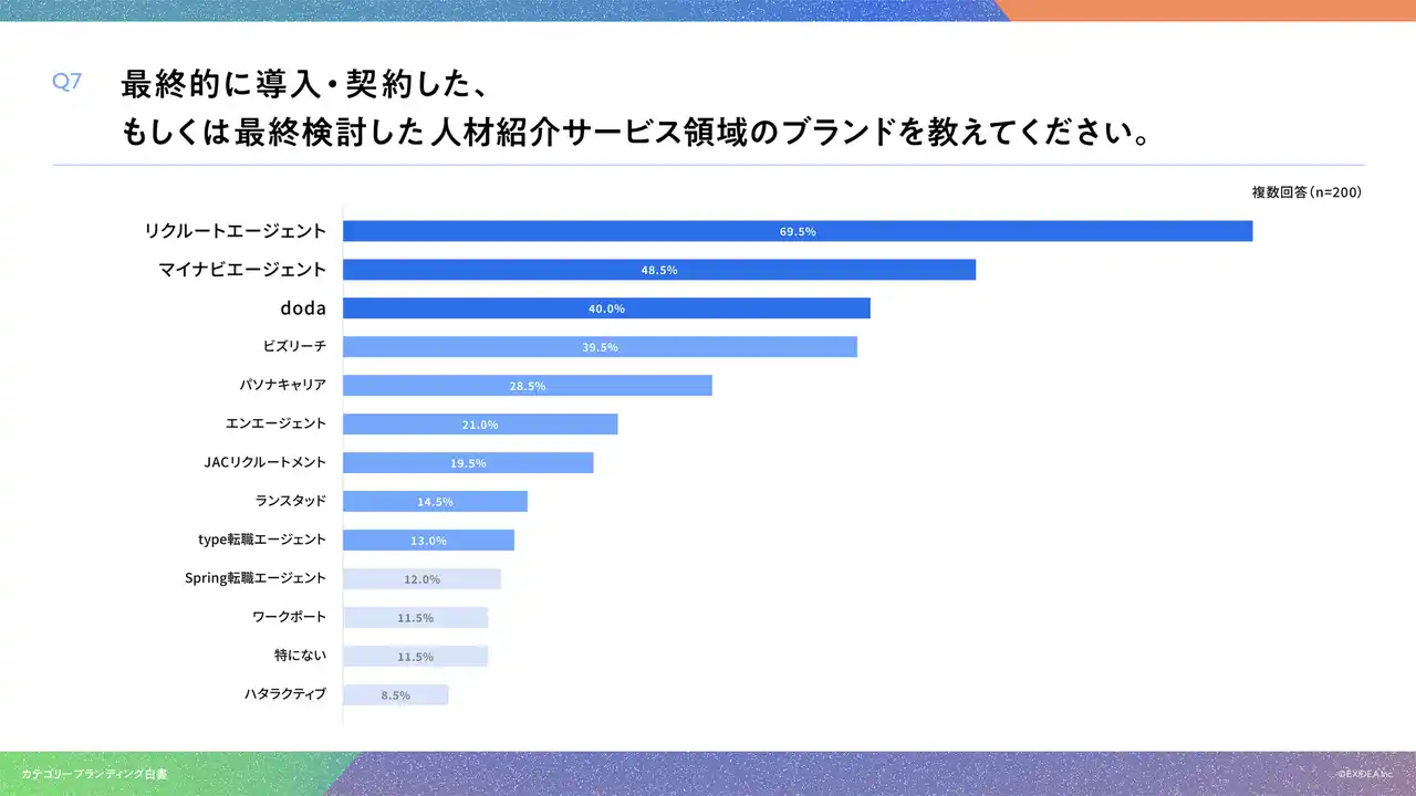「Q7. 最終的に導入・契約した、もしくは最終検討した人材紹介サービス領域のブランドを教えてください。(複数回答)」(n=200)と質問したところ、「リクルートエージェント」が69.5%、「マイナビエージェント」が48.5%、「doda」が40.0%という回答となりました。 |
