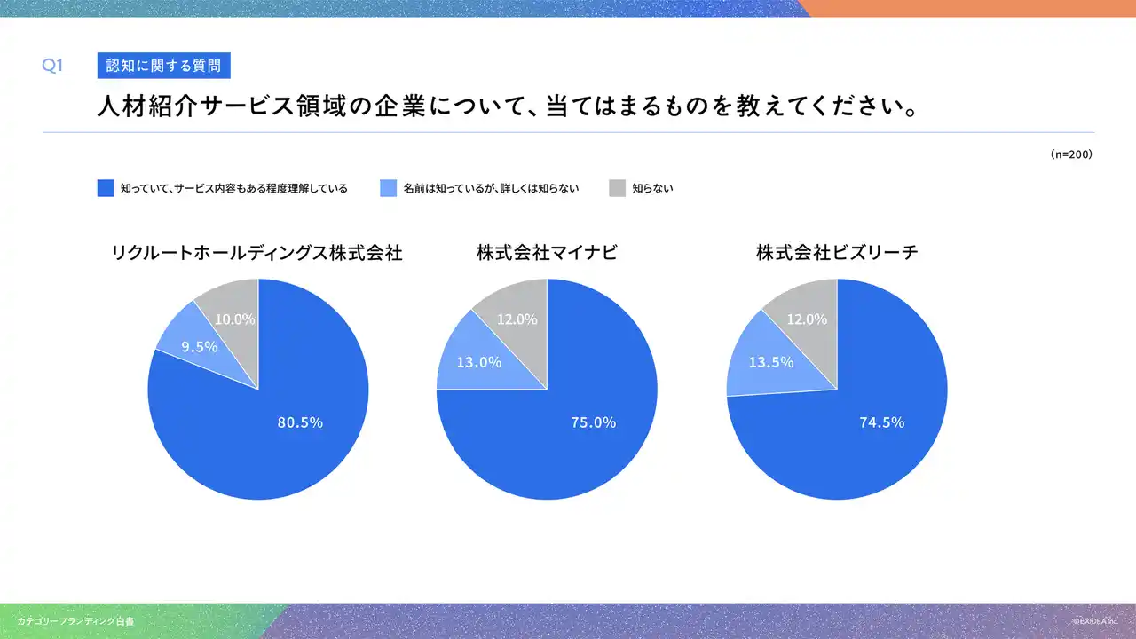 「Q1. 人材紹介サービス領域の企業について、当てはまるものを教えてください。」(n=200)と質問したところ、「知っていて、サービス内容もある程度理解している」と回答した割合について、リクルートホールディングス株式会社が80.5%、株式会社マイナビが75.0%、株式会社ビズリーチが74.5%という結果になりました。 |