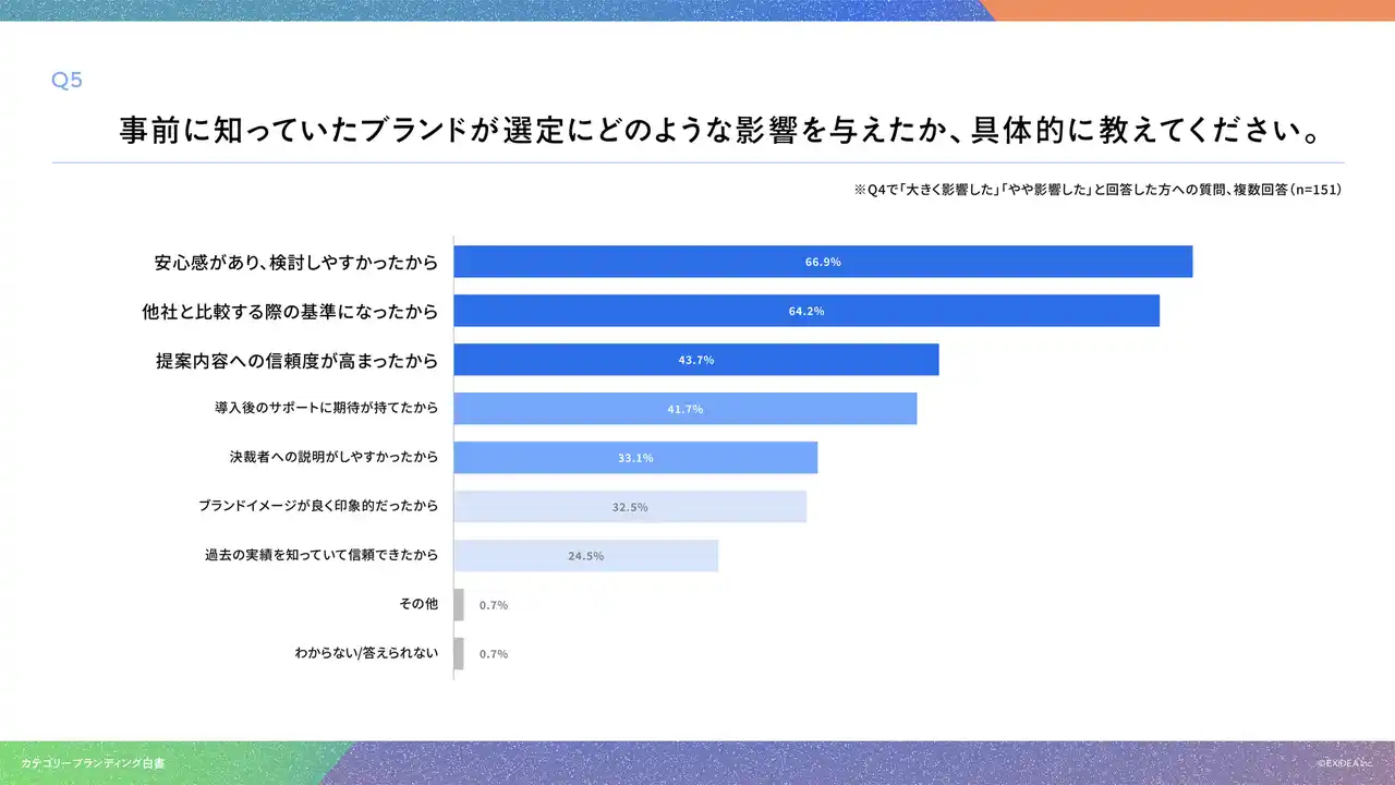 「Q5. Q4で「大きく影響した」「やや影響した」と回答した方にお聞きします。事前に知っていたブランドが選定にどのような影響を与えたか、具体的に教えてください。(複数回答)」(n=151)と質問したところ、「安心感があり、検討しやすかったから」が66.9%、「他社と比較する際の基準になったから」が64.2%、「提案内容への信頼度が高まったから」が43.7%という回答となりました。 |