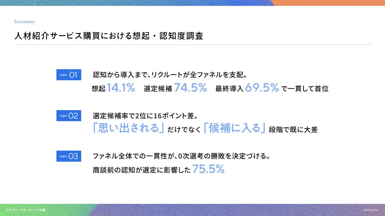 01|認知から導入まで、リクルートが全ファネルを支配。想起14.1%、選定候補74.5%、最終導入69.5%で一貫して首位 |
