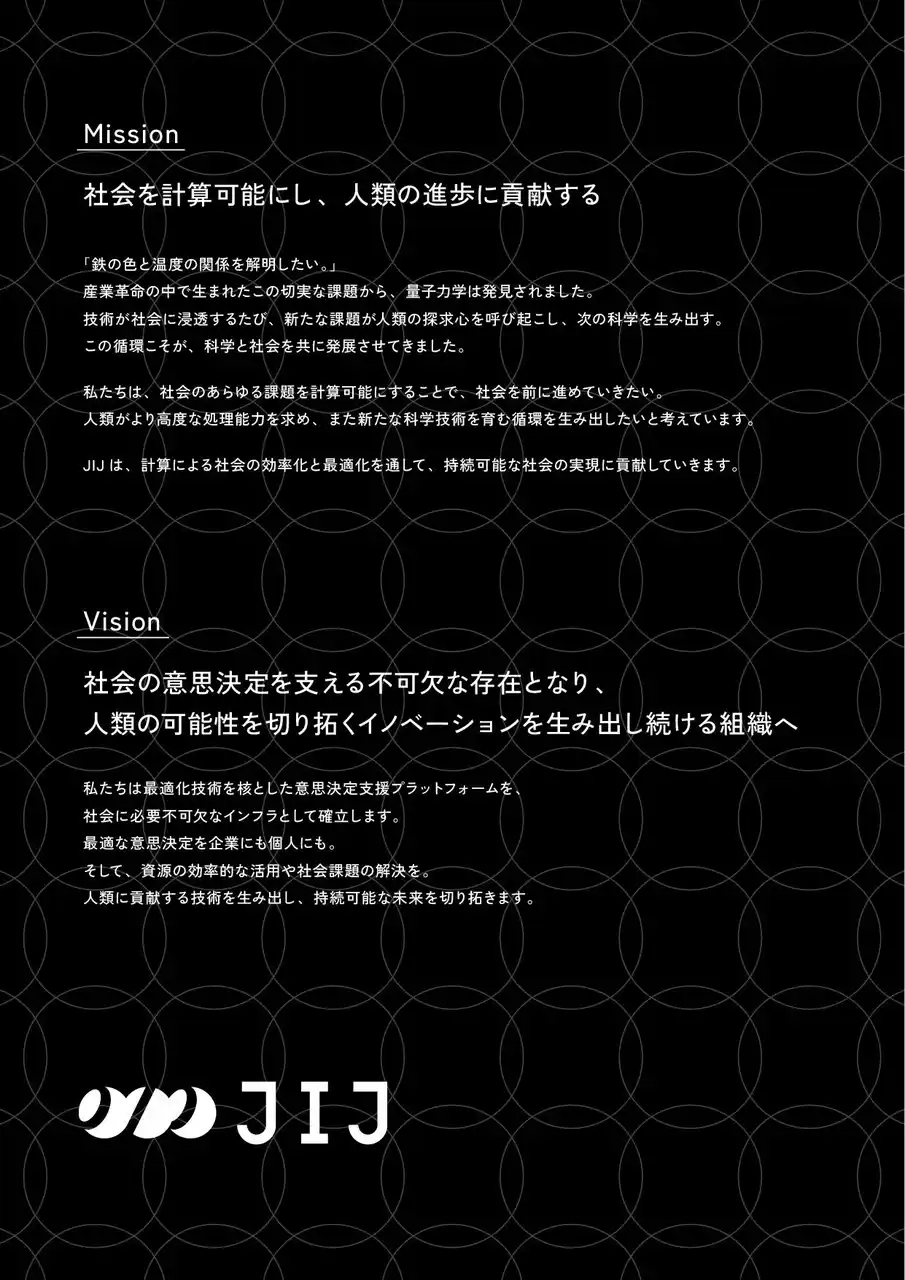 「鉄の色と温度の関係を解明したい。」 産業革命の中で生まれたこの切実な課題から、量子力学は発見されました。 技術が社会に浸透するたび、新たな課題が人類の探求心を呼び起こし、次の科学を生み出す。 この循環こそが、科学と社会を共に発展させてきました。 私たちは、社会のあらゆる課題を計算可能にすることで、社会を前に進めていきたい。 人類がより高度な処理能力を求め、また新たな科学技術を育む循環を生み出したいと考えています。 JIJは、計算による社会の効率化と最適化を通して、持続可能な社会の実現に貢献していきます。 |