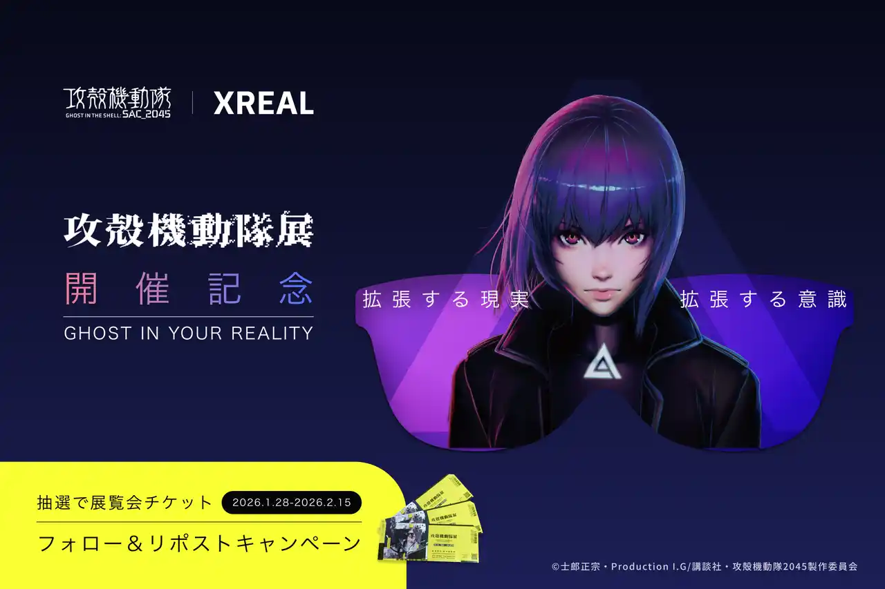 AR(拡張現実)グラスを開発・販売しているXREALは、2026年1月30日(金)から4月5日(日)まで、虎ノ門ヒルズの情報発信拠点「TOKYO NODE(東京ノード)」にて開催する「攻殻機動隊」全アニメシリーズを横断する史上初の大規模展『攻殻機動隊展 Ghost and the Shell』にて、XREALブースを出展することをお知らせいたします。 |