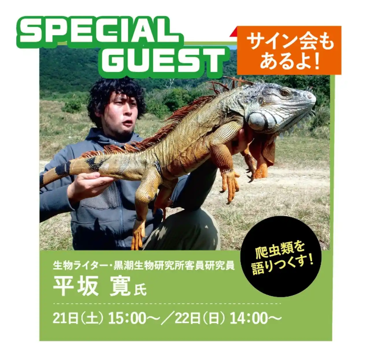| 生き物専門ライターとして世界を飛び回り今やYouTubeチャンネル登録者数94.8万人を誇る平坂寛氏が両日ステージに登壇!もはやレプタイルズフィーバー恒例となった平坂氏によるトークショー、今回はどんな話が聞けるのかお楽しみに。 | |||