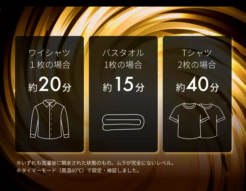 除菌率99.99% ※3【試験名】花粉除去試験【試験先】自社検査【試験方法】ポリエステル100%の布に疑似花粉(染色石松子)を付着させる。マイクロスコープで付着した部分を撮影し範囲内の疑似花粉をカウントする。タイマーモードで衣類乾燥機を運転させ、同じ場所を再度マイクロスコープで撮影し疑似花粉をカウントする。【試験結果】花粉除去率96.6%を確認 |
