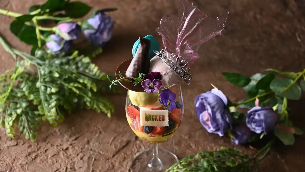 パフェ中段には、グリンダのドレスを表現したジュレをあしらい、中心にはサプライズをご用意しました。映画の世界観をたっぷり詰め込んだ特別なパフェをお楽しみください。 |