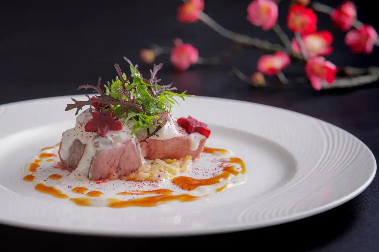 フランス料理「SAKURA」では、地上18階のパノラマビューとともに、厳選された旬の食材にフランス料理の伝統とモダンを融合させた至福のコースをご用意いたしました。前菜には、脂の乗った旬の寒ブリを柑橘の香りで爽やかに仕立てた「柑橘薫る寒ブリのマリネ」を。メインディッシュの「仔牛ロース肉のロティ」は、しっとりと柔らかな肉質と上品な旨味が特徴です。窓一面に広がる梅林の紅白とリンクするような華やかな盛り付けが、特別なランチタイムを演出します。 |