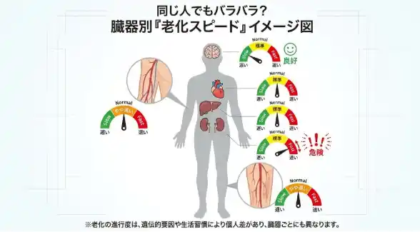 さらに興味深いのは、一人の人間の中でも「老化のスピード」は均一ではないという点です。スタンフォード大学などの研究によると、心臓、腎臓、肝臓、免疫系など、臓器やシステムごとに老化の進み具合が異なることが分かってきています。 |