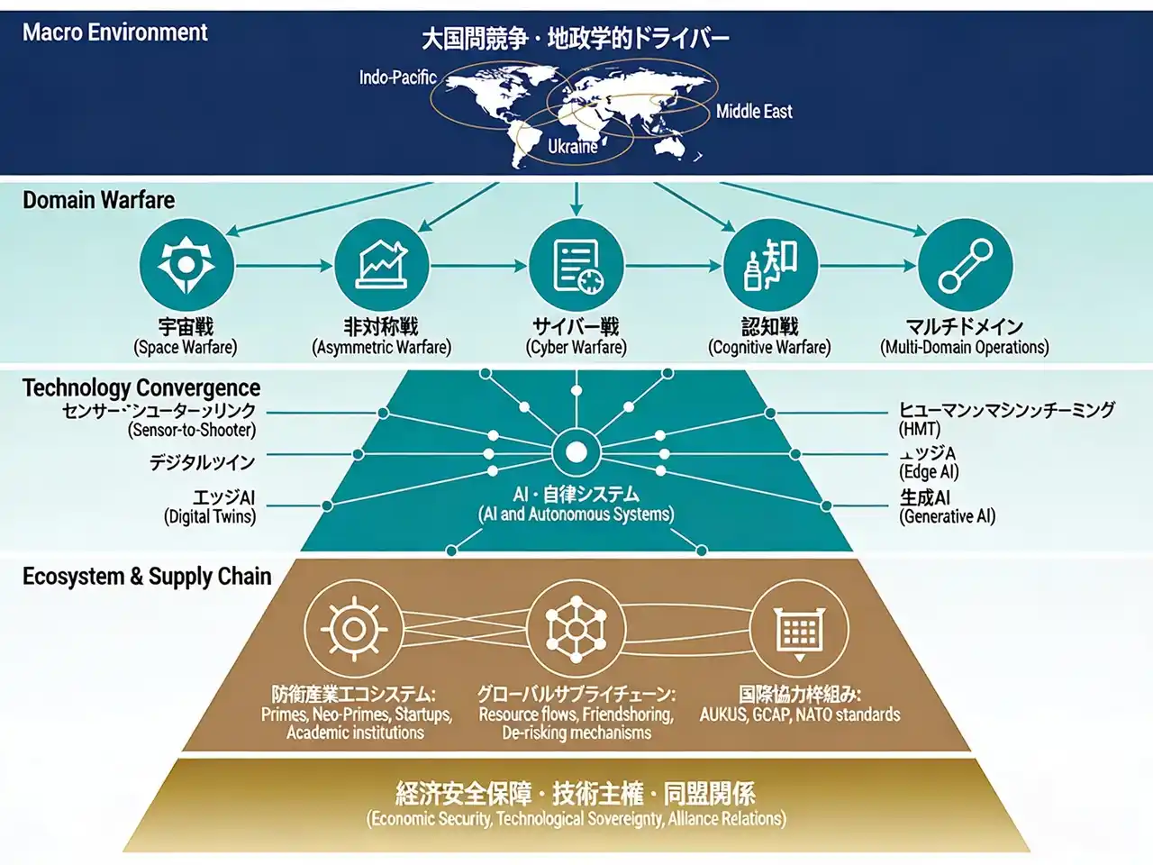 | 台湾海峡有事シナリオから弾薬不足という産業基盤の脆弱性まで、戦略環境と防衛産業の接点を具体的に分析することで、企業・研究機関・政策機構が直面する実装課題と機会を明らかにする。 | |||||||||||||||||||