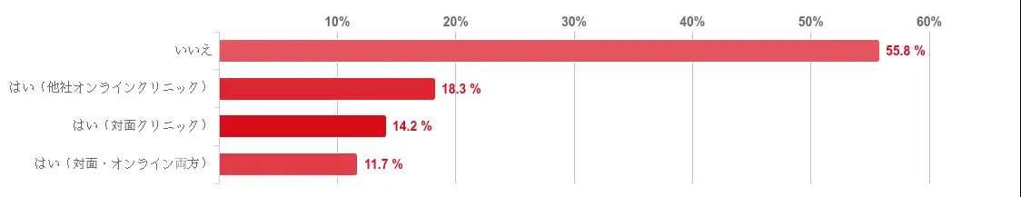 「いいえ」と回答した人が55.8%で半数を超えて最も多かったが、「はい」の回答としては、「はい(他社オンラインクリニック)」(18.3%)、「はい(対面オンラインクリニック)」(14.2%)、「はい(対面・オンライン両方)」(11.7%)という順となった。 |