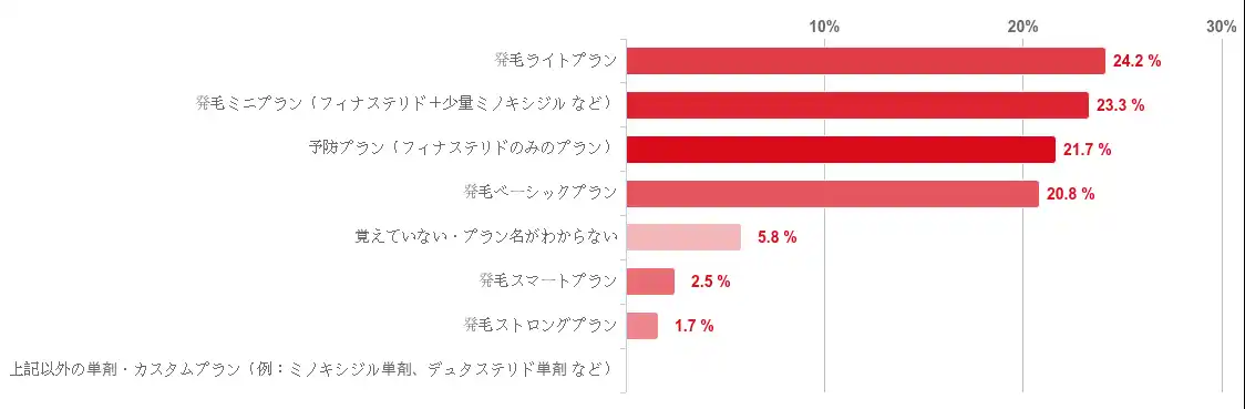 「発毛ライトプラン」と回答した人が24.2%で最も多く、次いで「発毛ミニプラン」との回答が23.7%、「予防プラン」が21.7%、「発毛ベーシックプラン」が20.8%と共に2割程度で続いた。そのほか、「発毛スマートプラン」(2.5%)や「発毛ストロングプラン」(1.7%)との回答は僅かとなった。 |
