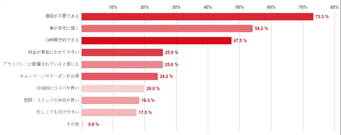 「通院が不要である」との回答が73.3%で最も多く、次に「薬が自宅に届く」との回答が54.2%、「24時間予約できる」が47.5%で続いた。そのほか、「料金が事前にわかりやすい」「プライバシーに配慮されていると感じる」「キャンペーンやクーポンがお得」「総合的にコスパが良い」との回答も2割以上集まった。 |