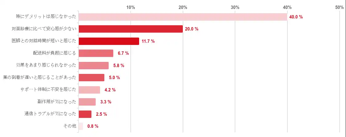 「特にデメリットは感じなかった」と回答した人が40.0%で最も多かった。なお、デメリットとしてあがった回答として「対面診療に比べて安心感が少ない」が20.0%で最も多く、そのほか「医師との対話時間が短いと感じた」や「配送料が負担に感じる」と回答した人がみられた。 |