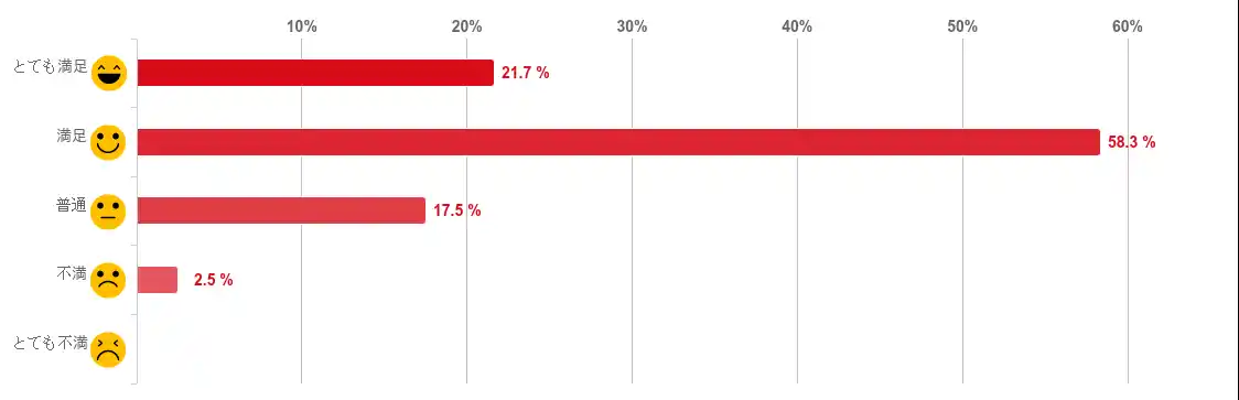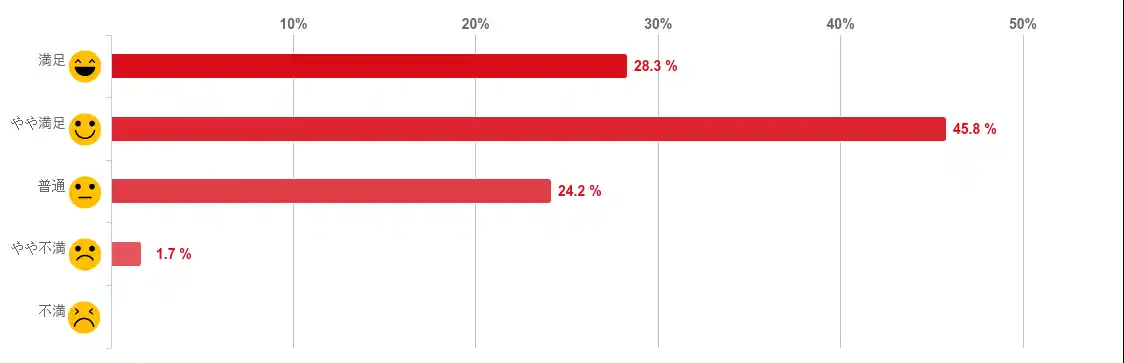 「やや満足」と回答した人が45.8%で約5割となり最も多く、「非常に満足」との回答と合わせると7割以上の人が満足していることがわかった。反対に、「やや不満」と回答した人は1.7%と僅かで、「不満」と回答した人はいなかった。 |