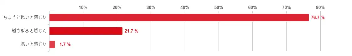 「ちょうど良いと感じた」との回答が76.7%で圧倒的に多く、「短すぎると感じた」(21.7%)との回答数を大きく上回った。反対に、「長いと感じた」と回答した人は1.7%と僅かだった。 |