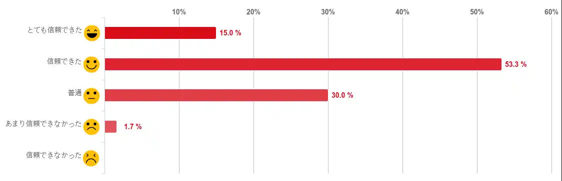 「信頼できた」と回答した人が53.3%で過半数となり最も多く、「とても信頼できた」(15.0%)との回答と合わせると約7割の人が医師の説明や対応について「信頼できた」と感じていることがわかった。反対に、「あまり信頼できなかった」と回答した人は1.7%と僅かとなり、「信頼できなかった」と回答した人はいなかった。 |
