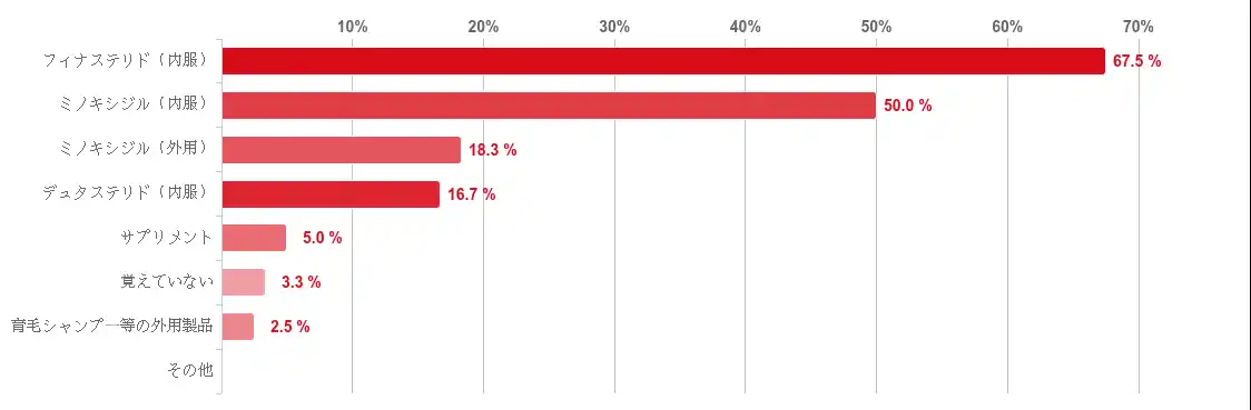 「フィナステリド(内服薬)」と回答した人が67.5%で最も多く、次いで「ミノキシジル(内服)」との回答が50.0%と続き、この二つの回答が多くの割合を占めた。そのほか、「ミノキシジル(外用)」が18.3%、「デュタステリド(内服)」が16.7%と一定数の回答を得た。 |
