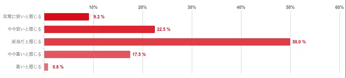 「妥当だと感じる」と回答した人が50.0%と回答者の半数を占め最も多く、次に「やや安いと感じる」との回答が22.5%となり、「非常に安いと感じる」(9.2%)と回答した人を合わせると8割以上の人はDMMオンラインクリニックのAGA治療の料金設定に納得していることがわかった。なお、「高いと感じる」と回答した人は僅かだった。 |