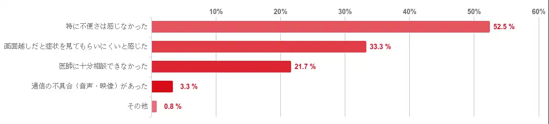「特に不便さは感じなかった」と回答した人が52.5%で最も多かったが、そのほか、「画面越しだと症状を見てもらいにくいと感じた」との回答が33.3%、「医師に十分相談できなかった」が21.7%と一定数みられた。 |