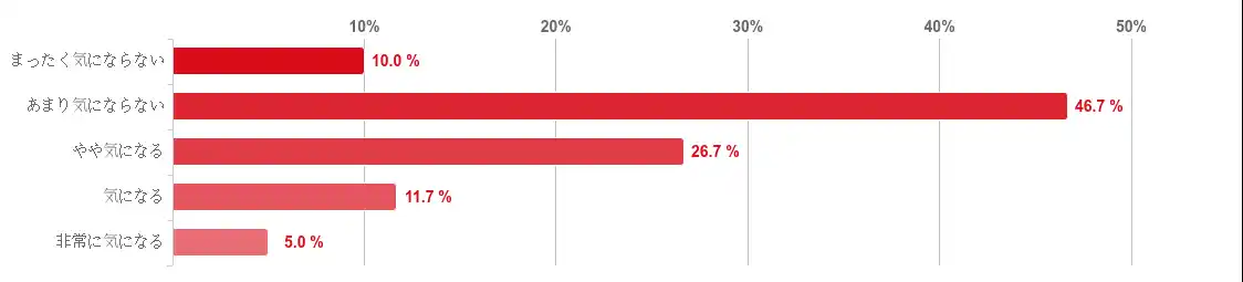 「あまり気にならない」と回答した人が46.7%と約5割で最も多く、次いで「やや気になる」との回答が26.7%で続いた。また、「まったく気にならない」と回答した人が10.0%で「あまり気にならない」との回答と合わせると約6割となり、「気になる」と感じている人より若干多いことがわかった。 |
