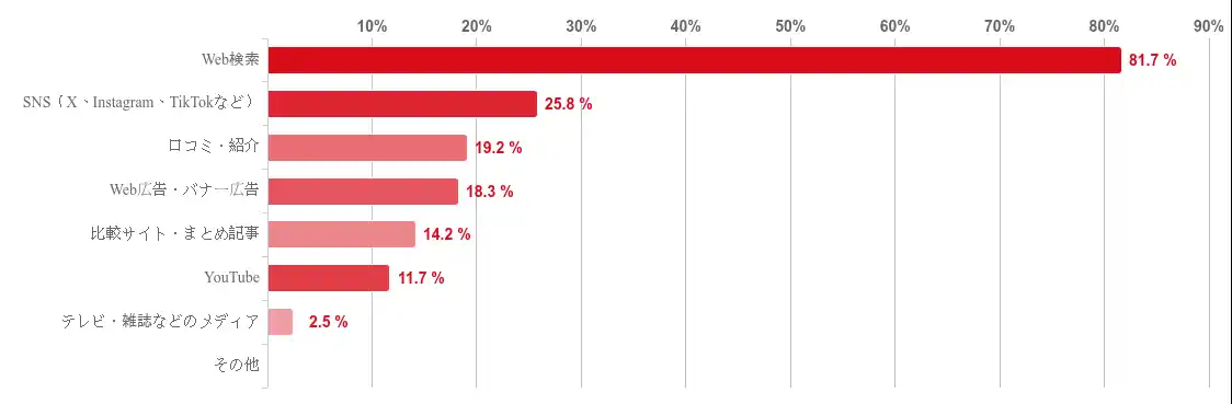 「Web検索(GoogleやYahoo!など)」と回答した人が81.7%で圧倒的に多く、次いで「SNS(X、Instagram、TikTokなど)」(25.8%)、「口コミ・知人の紹介」(19.2%)という順となった。 |