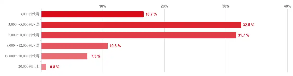 「3,000~5,000円未満」と回答した人が32.5%で最も多く、次いで「5,000~8,000円未満」との回答が31.7%で続いた。そのほか、「3,000円未満」と回答した人が16.7%、「8,000~10,000円未満」との回答が10.8%となり、回答者の6割以上の人の1ヶ月あたりの負担額が「3,000~8,000円未満」だということがわかった。 |