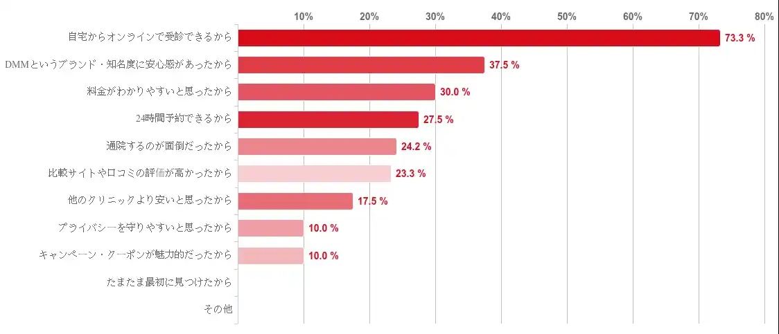 「自宅からオンラインで受診できるから」と回答した人が73.3%で圧倒的に多かった。続いて、「DMMというブランド・知名度に安心感があったから」(37.5%)、「料金がわかりやすいと思ったから」(30.0%)、「24時間予約できるから」(27.5%)という順で並んだ。 |
