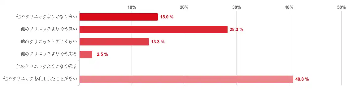 「他のクリニックを利用したことがない」と回答した人が40.8%で最も多かったが、「他のクリニックよりやや良い」と回答した人が28.3%、次いで「他のクリニックよりかなり良い」が15.0%で続き、他のクリニックよりも良いと感じている人が多いことがわかった。そのほか、「他のクリニックと同じくらい」と回答した人が13.3%%、「他のクリニックよりやや劣る」との回答が2.5%で「他のクリニックよりかなり劣る」と回答した人はいなかった。 |