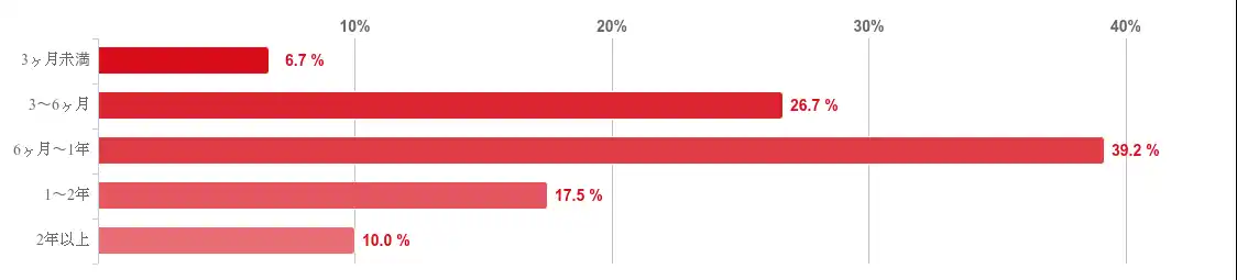 「6か月~1年」と回答した人が39.2%で最も多く、次に「3~6か月」との回答が26.7%、「1~2年」が17.5%という順となった。そのほか、「2年以上」と回答した人は10.0%で、「3か月未満」が6.7%となり、回答者の多くの治療期間が「3か月~2年未満」ということがわかった。 |