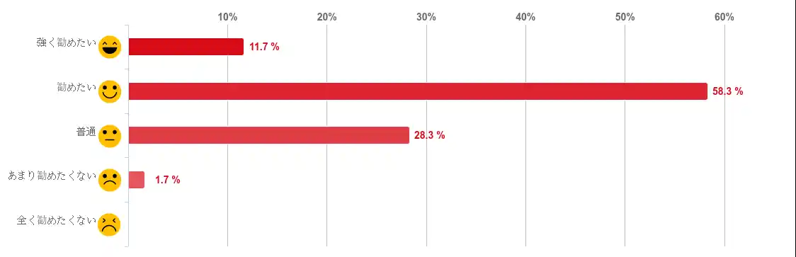 「勧めたい」と回答した人が58.3%で、過半数となり最も多く、「強く勧めたい」との回答と合わせると約7割の人が薄毛で悩んでいる友人や家族などにDMMオンラインクリニックを勧めたいと思っていることがわかった。反対に、「あまり勧めたくない」と回答した人は1.7%と僅かで「全く勧めたくない」と回答した人はいなかった。 |