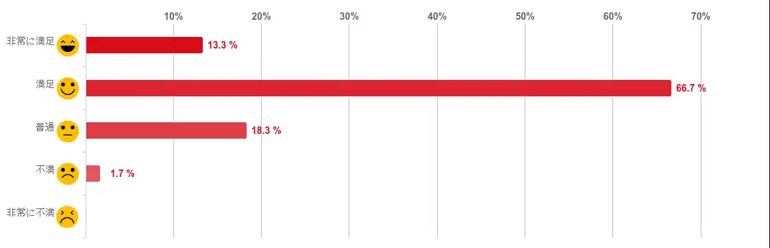 「満足」と回答した人が66.7%となり、約7割で最も多く、「非常に満足」との回答と合わせると約8割の人が満足していることがわかった。反対に、「不満」と回答した人は1.7%と僅かで「非常に不満」と回答した人はいなかった。 |