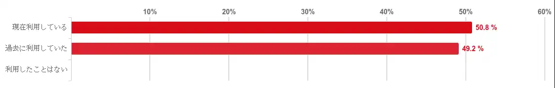 「現在利用している」と回答した人が50.8%で、「過去に利用していた」との回答の49.2%を若干上回った。 |