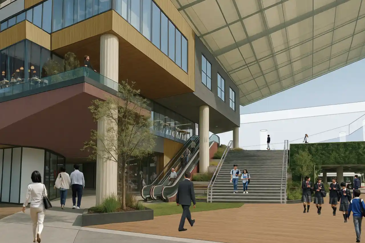 「1階 駅前南コンコース」大階段と駅前商業施設イメージ |