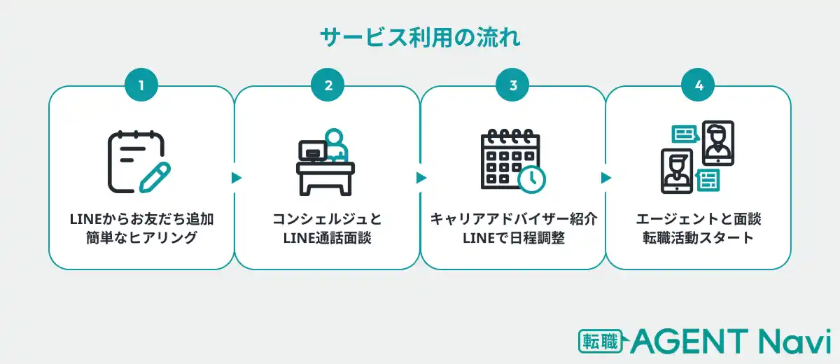 「転職AGENT Navi」は、求職者とキャリアアドバイザーを繋ぐマッチングサービスです。転職活動に精通した経験豊富な「転職AGENT Navi」のコンシェルジュが求職者とLINE通話で面談を行い、求職者のニーズに合わせてキャリアアドバイザーを複数名紹介。その後、マッチングしたキャリアアドバイザーと転職活動がスタートします。 |
