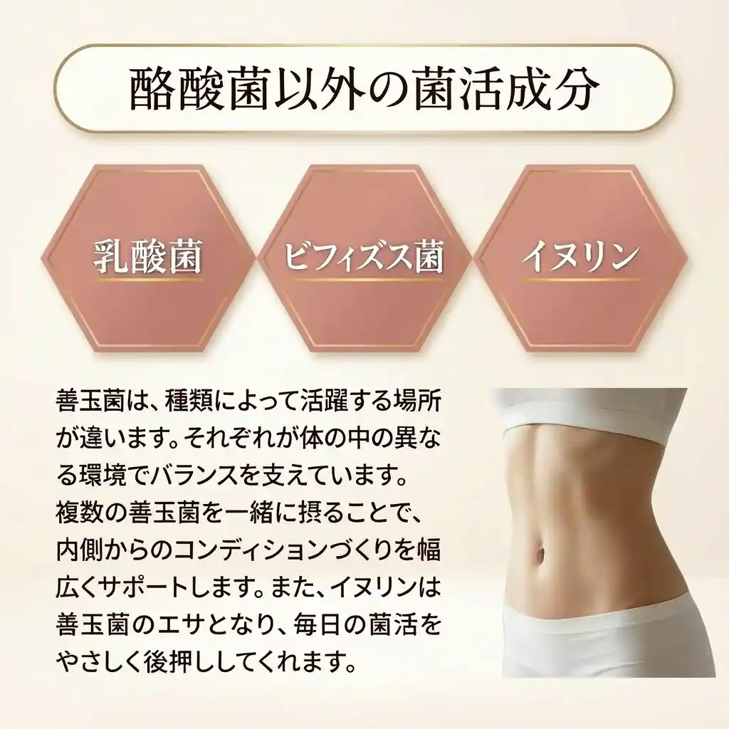 単なる栄養補給にとどまらず、内側から整える成分を配合。短鎖脂肪酸「酪酸」を作り出す酪酸菌は、体を内側から整えたい方に注目されている成分です。本製品では酪酸菌に加え、乳酸菌、ビフィズス菌、食物繊維を配合し、体内フローラを意識する方をサポートします。 |