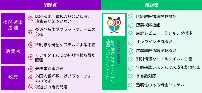 弊社はこうした課題を解決し、誰もが安心・安全に夜遊びを楽しめる環境を実現するため、プラットフォームアプリ「JP NIGHT」を開発しました。 |