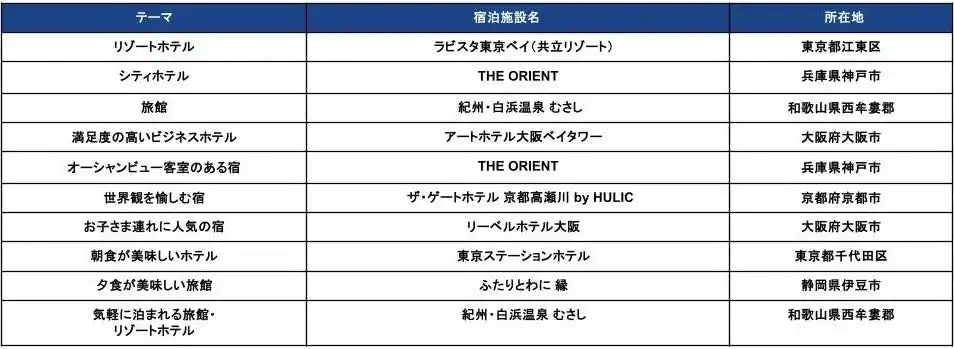 さらに、テーマ別ランキングの「シティホテル」や「オーシャンビュー客室のある宿」に加え、エリア別「近畿」でも首位を獲得するなど、複数のテーマで高い評価を受けました。 |