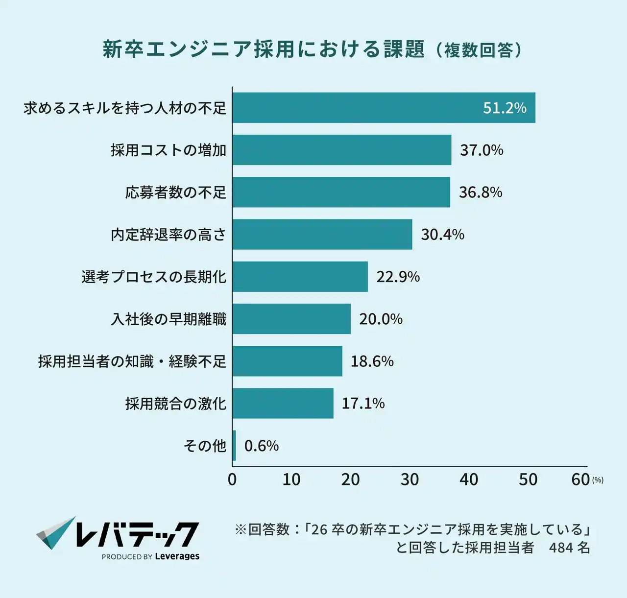新卒エンジニア採用における課題については「求めるスキルを持つ人材の不足(51.2%)」が最も多く、「採用コストの増加(37.0%)」「応募者数の不足(36.8%)」「内定辞退率の高さ(30.4%)」が続きます。近年は少子化も影響し企業間の新卒採用競争が激化していることに加え、求められるスキルのレベルが上昇していることが、採用難に繋がっていると考えられます。 |